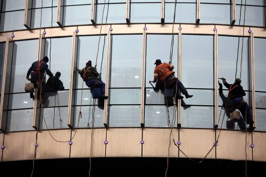 سيكون هناك بعض 'الرجل العنكبوت' يزحف لأعلى ولأسفل فوق المباني الشاهقة. في الواقع، هم منظفات الزجاج. غالبًا ما يعملون في مثل هذا المكان المرتفع، في تنظيف الزجاج أو تنظيف بعض البقع على الحائط، وما إلى ذلك. ويستخدمون الرافعات والأدوات أثناء عملهم.