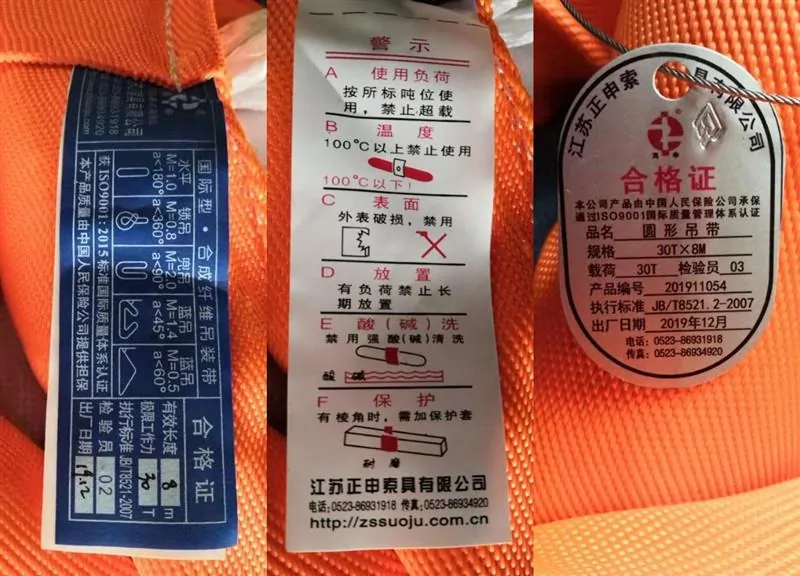1. The slings shall be provided with necessary safety signs, and the performance parameters such as the name, specifications, model, lifting weight, etc. of the slings shall be identified as needed, as well as the precautions for use.